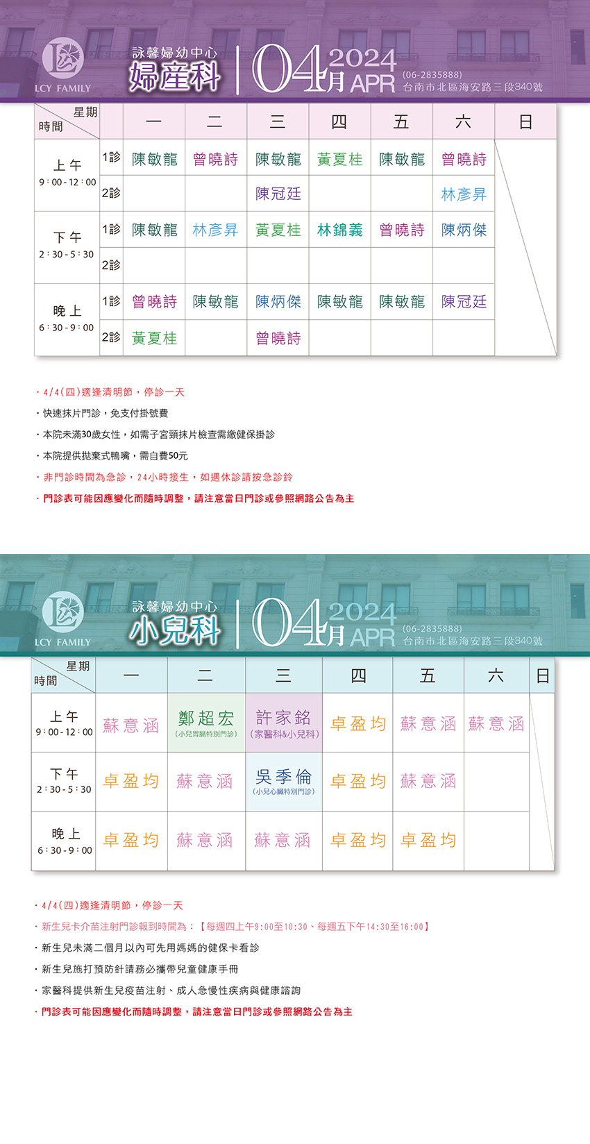 2024年4月份門診時間來囉! 如有相關問題,歡迎前來預約唷!